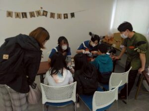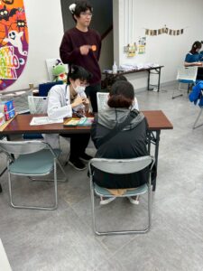 今回の私達のメイン企画は「お医者さん・看護師さん体験」です。看護師さん体験ではバイタル測定や正常値を本物の看護師さんに教わります。お医者さん体験ではお子さんがお医者さんになりきって、患者さん役の保護者に問診をしていきます。中にはお子さんから保護者へかなりストレートな指摘もありました。ナース服や白衣、聴診器でなりきった姿で記念写真も撮り、楽しい記念になったでしょうか。